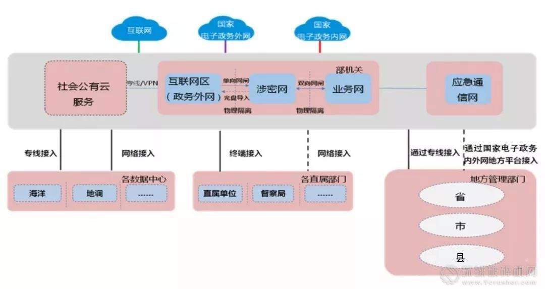 自然資源“一張網”是支持跨部門、跨層級、跨區域的海量數據處理和業務應用的基礎設施,也是自然資源系統與國家整體政務系統的接入通道。“一張網”包括了涉密內網、業務網、互聯網(政務外網)和自然資源應急通信網,同時接入國家電子政務內網和電子政務外網。總體結構如下圖: