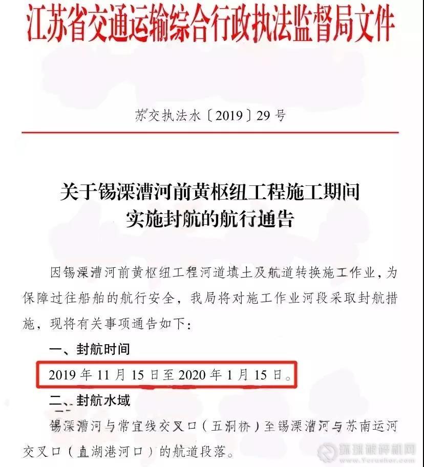根據江蘇省交通運輸綜合行政執法監督局《關于錫溧漕河前黃樞工程施工期間實施封航的航行通告》要求,自11月15日至2020年1月15日,錫溧漕河與常宜線交叉口(五洞橋)至錫溧漕河與蘇南運河交叉口(直湖港河口)的航道全面封航,封航時間總計2個月。