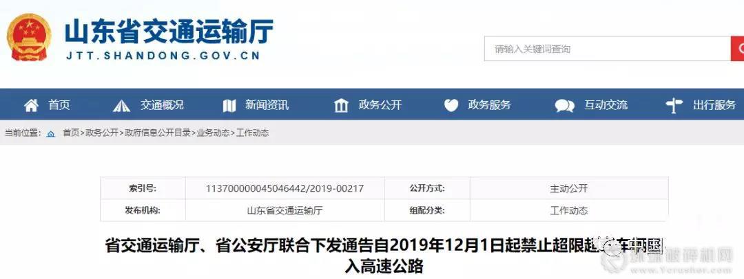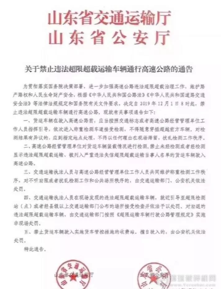 為進一步加強高速公路違法超限超載治理工作,山東省交通運輸廳與省公安廳聯合下發通告,決定自2019年12月1日8時起,禁止違法超限超載運輸車輛通行高速公路。
