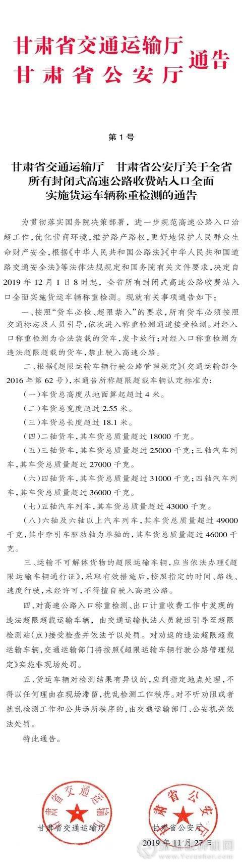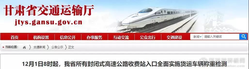 11月27日,甘肅省交通運輸廳、甘肅省公安廳發布通告,自2019年12月1日8時起,甘肅省所有封閉式高速公路收費站入口全面實施貨運車輛稱重檢測。