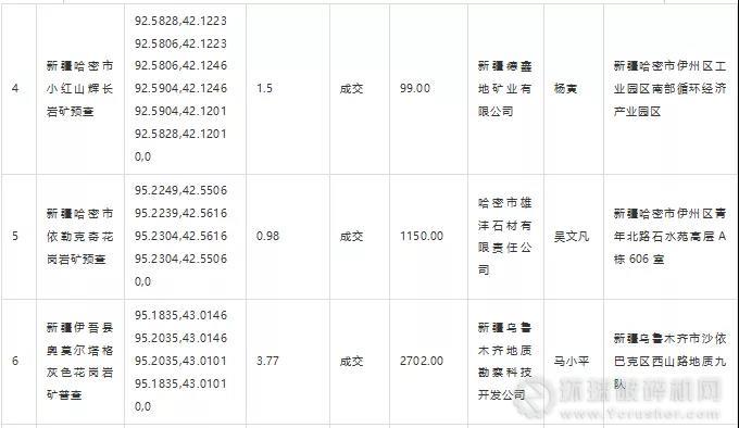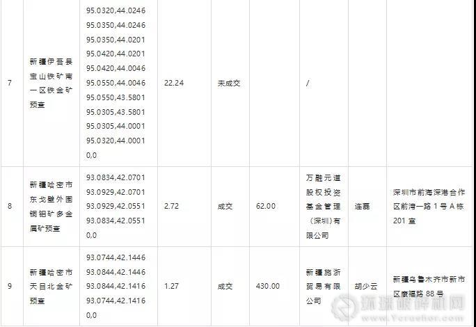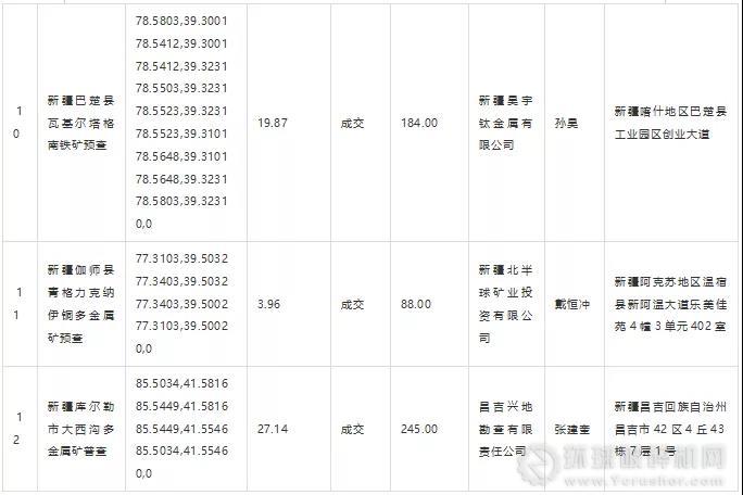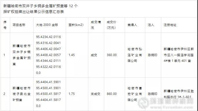 附表:新疆哈密市雙井子鄉銅多金屬礦預查等12個探礦權掛牌出讓結果公示信息匯總表