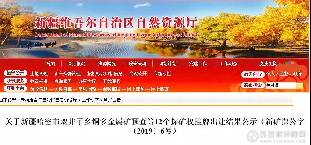2019年11月22日,按照《新疆維吾爾自治區自然資源廳探礦權掛牌出讓公告》(新礦探告字〔2019〕7號)程序,新疆哈密市雙井子鄉銅多金屬礦預查探礦權等12個探礦權在自治區國土資源交易中心以掛牌方式出讓成交。根據《礦業權交易規則》等有關規定,現對該探礦權出讓有關事項進行公示(具體內容見附表)。