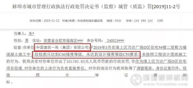 據蚌埠住房城鄉建設局官方網站公開的行政處罰決定書顯示,11月12日,該局向淮上區萬達廣場D區住宅項目經理朱某、中國建筑一局(集團)有限公司等相關單位或人員作出處罰。決定書稱,中國建筑一局(集團)有限公司在2019年3月淮上區萬達廣場D區住宅5#樓二層剪力墻混凝土施工過程中,存在未按照工程設計圖紙施工的行為,“經檢測只達到C40強度等級,未達到設計強度等級C50要求”。
