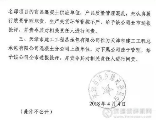 鳳凰網房產消息,2018年4月,一份傳播甚廣的天津市建委的內部文件顯示,天房樾梅江項目個別棟號存在混凝土強度不符合設計要求的質量問題。該文件要求不公開,但在天津相關政府網站掛出。
