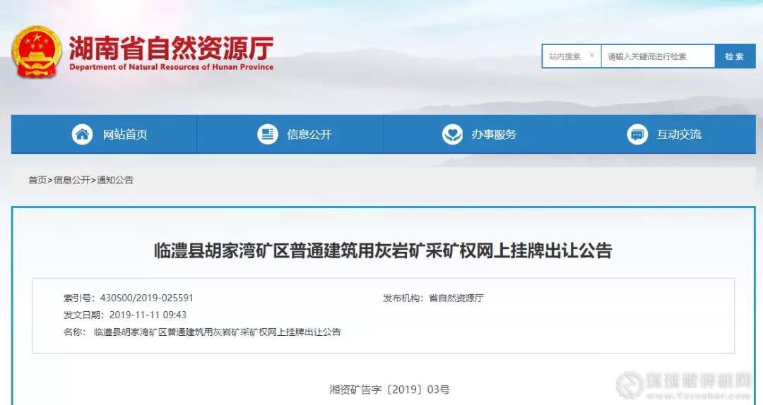 湖南省公共資源交易中心決定使用湖南省公共資源交易中心礦業權交易系統(以下簡稱交易系統),采取網上掛牌方式,組織公開出讓臨澧縣胡家灣礦區普通建筑用灰巖礦采礦權,現將有關事項公告如下:
