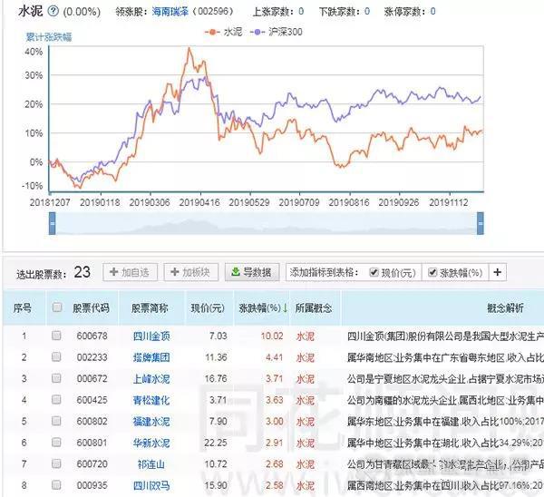 2019年12月9日,水泥板塊全線上漲,截至下午三點,四川金頂漲停,塔牌集團漲幅超4%,上峰水泥、青松建化、福建水泥、華新水泥、祁連山等跟漲。