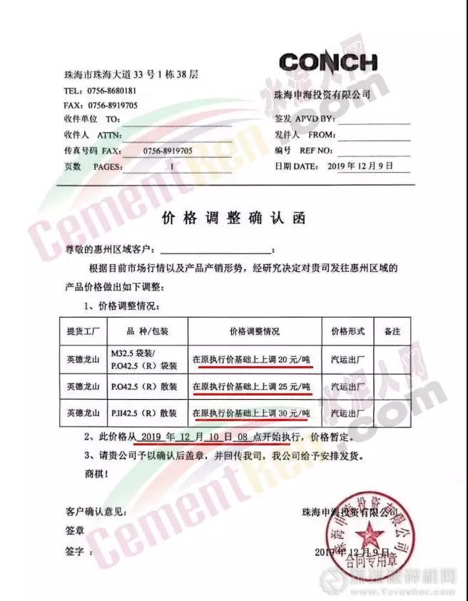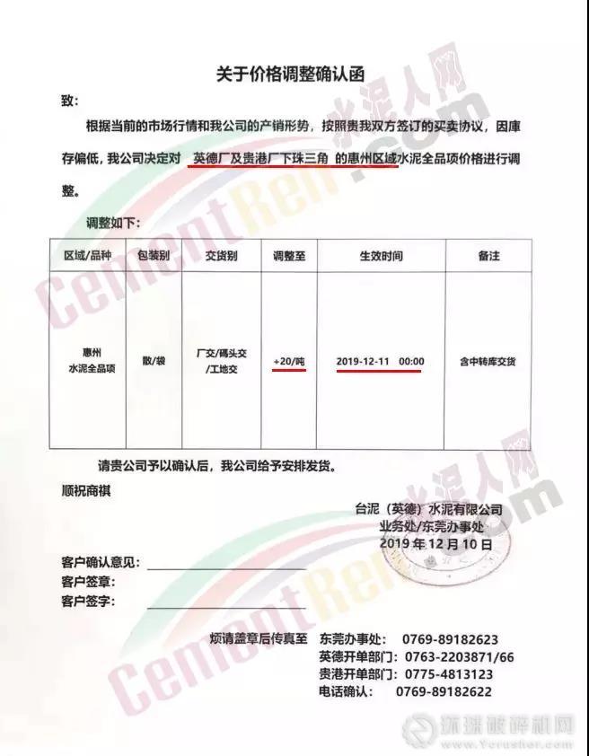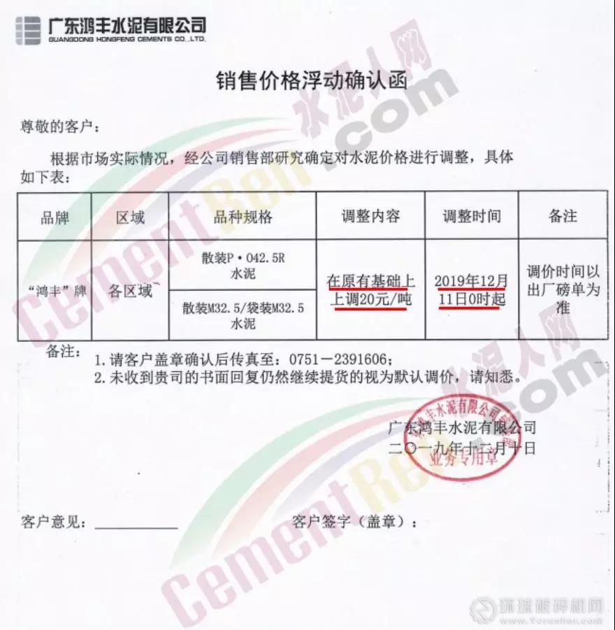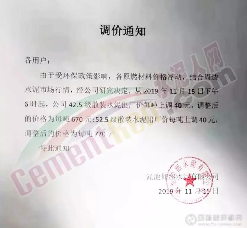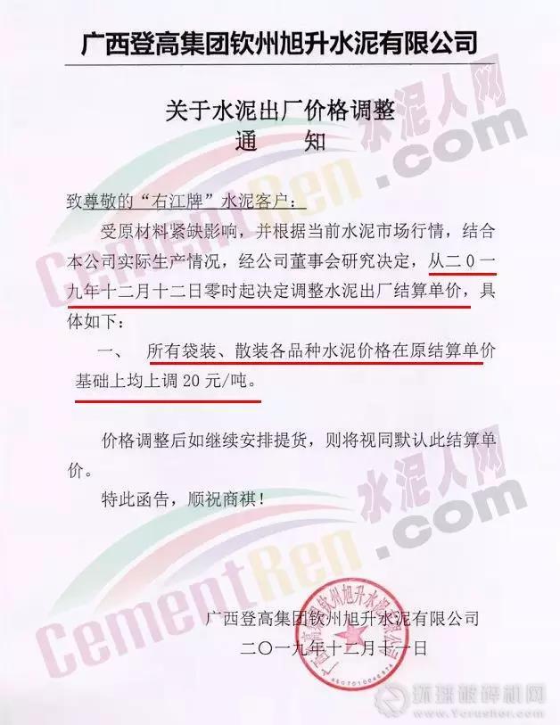 您好!根據當前市場形勢,本公司定于 2019年 12月 11日 8:00時起對各品種袋、散裝水泥價格上調20元/噸。