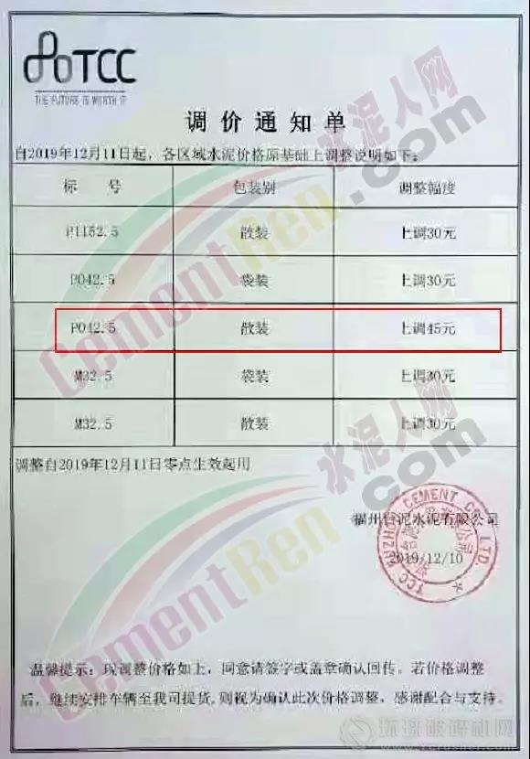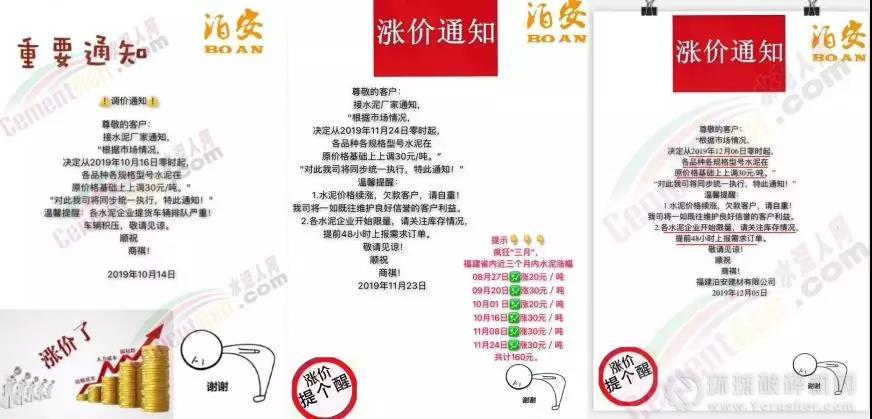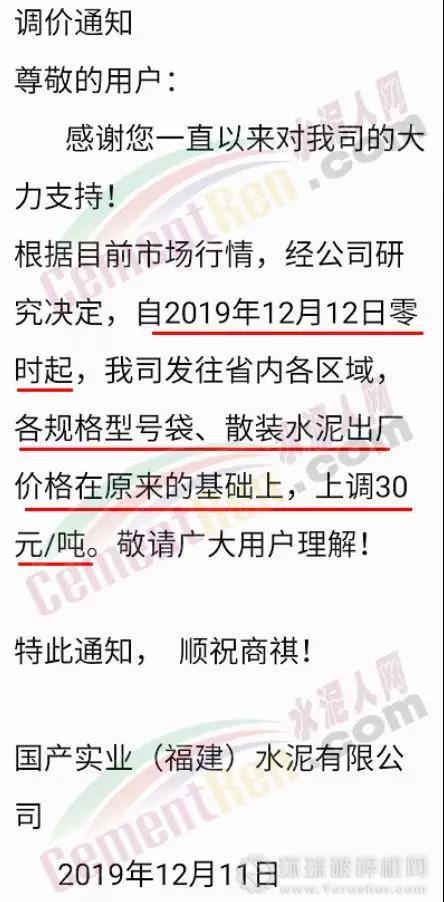 同時,福建區域也迎來了新一波的價格上漲,福建春馳集團新豐水泥有限公司通知自2019年12月12日零時起,發往省內各區域,各規格型號袋、散裝水泥出廠價格在原來的基礎上,上調30元/噸。