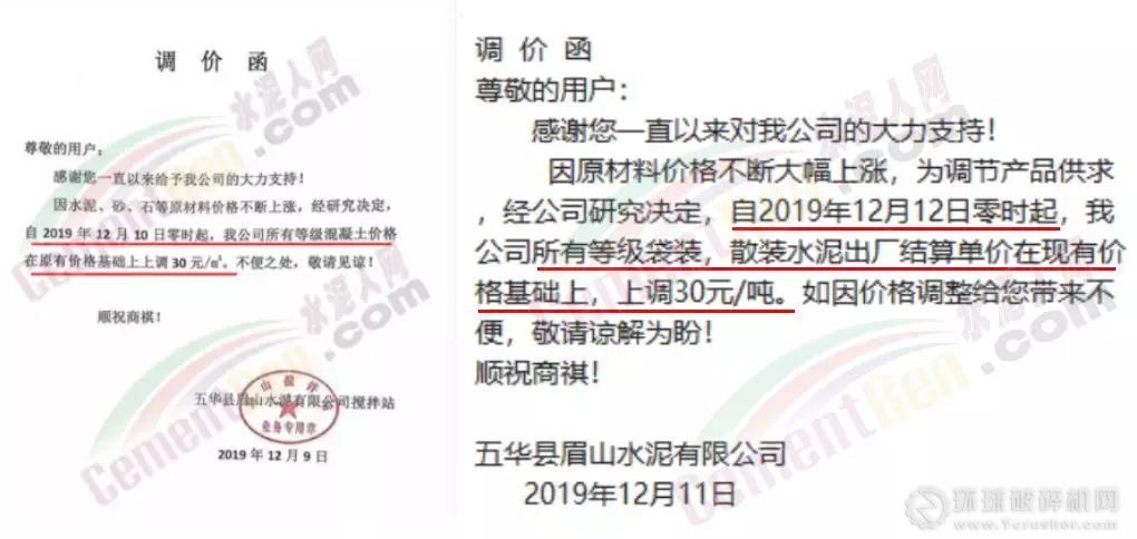12月11日五華縣眉山水泥有限公司發調價函稱,因原材料價格不斷大幅上漲,為調節產品供求,經公司研究決定,自2019年12月12日零時起,公司所有等級袋裝,散裝水泥出廠結算單價在現有價格基礎上,上調30元/噸。