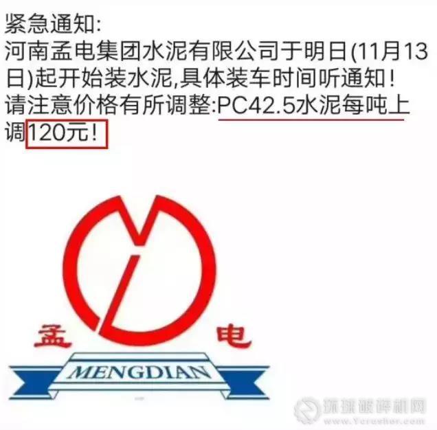 11月12日河南孟電集團水泥有限公司發布緊急通知稱:自11月13日起,PC42.5水泥每噸上調120元/噸,孟電水泥一鳴驚人,再次創下了近年水泥行業單次水泥價格上調幅最高的記錄。