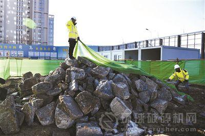 項目工地看到一種全新的建筑垃圾處理方式。用于臨時建筑的混凝土基礎被機器打碎,工人將產(chǎn)生的混凝土垃圾分類放置在旁邊的空地上,等待專業(yè)公司進行回收利用。