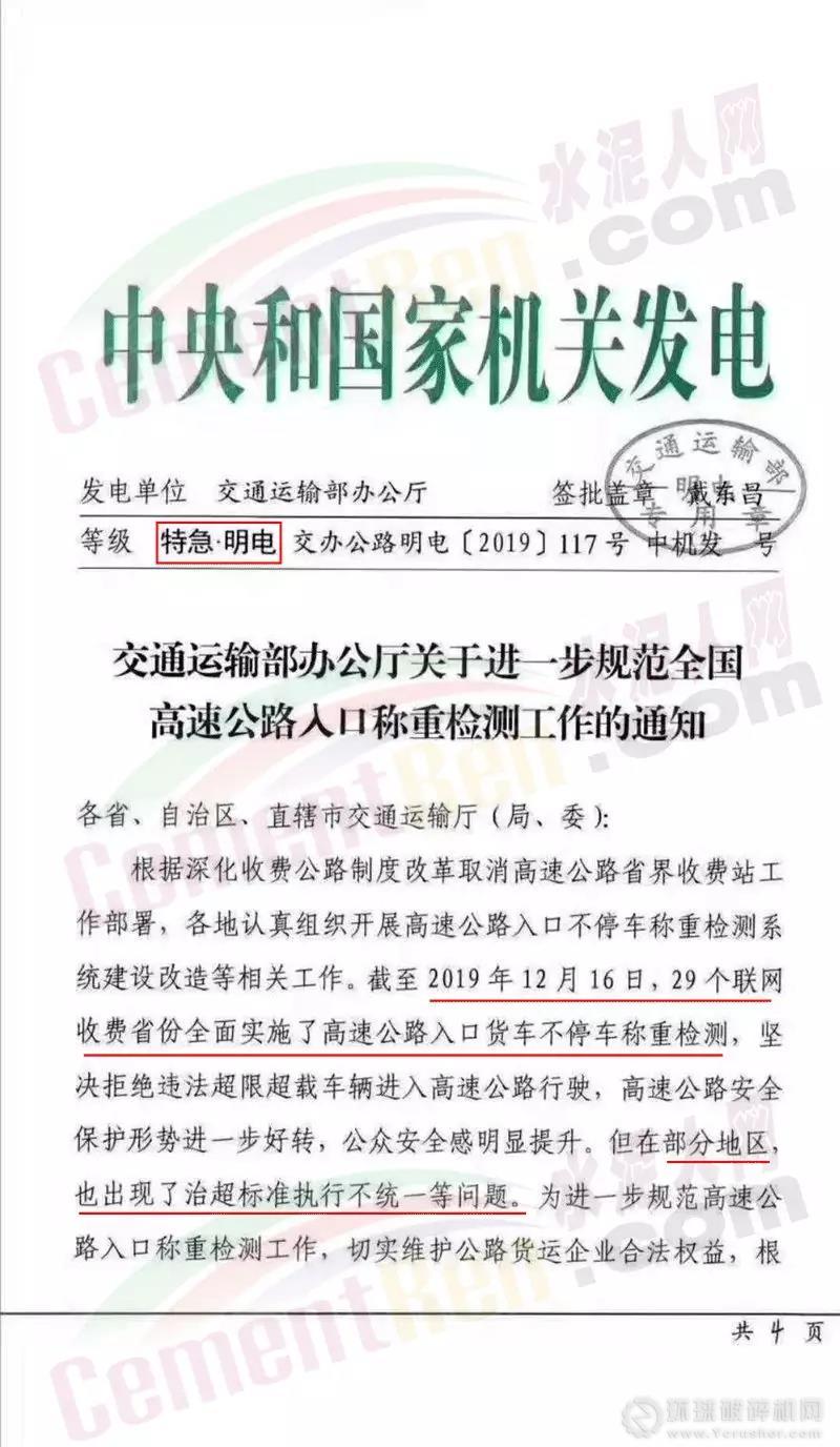 12月17日,交通運輸部辦公廳發布特急文件《關于進一步規范全國調整公路入口稱重檢測工作的通知》(交辦公路明電【2019】117號)(以下簡稱“《通知》”)。《通知》直指全國部分地區治超標準不統一的問題。為進一步規范高速公路入口稱重檢測工作,切實維護公路貨運企業合法權益,根據相關法律法規和規定,有關通知如下: