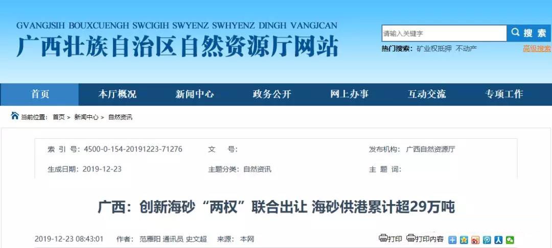 在參考吸納“兩權”聯合出讓成功經驗基礎上,廣西壯族自治區自然資源廳會同海洋局聯合印發了《關于海砂采礦權和海域使用權證實施聯合出讓的通知》,通過建立長效機制,進一步規范海砂采礦權和海域使用權出讓工作及海砂開采秩序。下一步,廣西自然資源廳將加強海砂開采管理,繼續推進海砂“兩權”出讓工作,優先保障海砂供港及地方產業發展需求。
