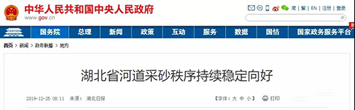 據了解,日前,中國政府網轉發了題為《湖北省河道采砂秩序持續穩定向好》的文章,體現了中央政府對湖北省打擊非法采砂亂象的高度重視。文章認為,經過常態化執法打擊,湖北省河道采砂秩序持續穩定向好,規模型非法采砂基本絕跡。