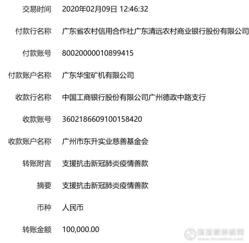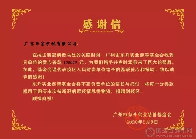 2月9日,廣東華寶礦機有限公司通過廣州東升實業慈善基金會捐贈善款10萬元,用于支持疫區的疫情防治工作。