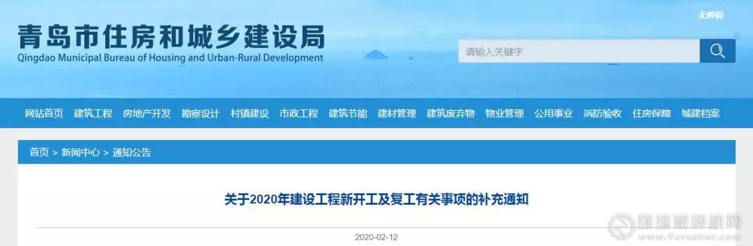 青島市住建局發布《關于2020年建設工程新開工及復工有關事項的補充通知》,明確: