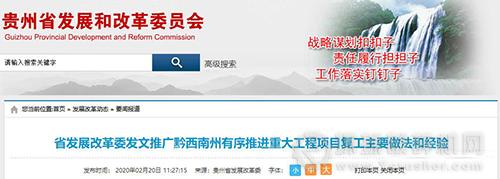 為更好推進省重大工程項目復工開工,2月19日,貴州省發展改革委印發通知,向各市州和貴安新區推廣黔西南州有序推進重大工程項目復工的主要做法和經驗,要求各地各有關部門和單位參考借鑒黔西南州的經驗做法,加快推進重大工程項目復工開工,確保完成各項復工開工任務。