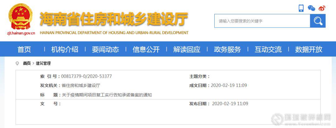 2020年2月19日,海南省住房和城鄉建設廳發布《關于疫情期間項目復工實行告知承諾備案的通知》,明確:擬復工項目應滿足規定的復工條件,落實好相關疫情防控工作,且已達到復工的安全生產條件。項目業主(建設單位)或者施工企業應在復工前向項目所在地住房城鄉建設主管部門備案。備案采用告知承諾制。項目所在地住房城鄉建設主管部門應在一個工作日內辦理完畢。