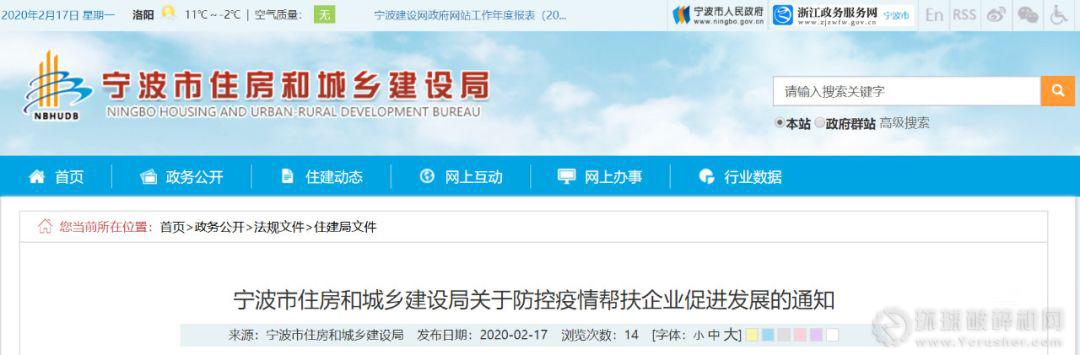 2020年2月17日,寧波市住房和城鄉建設局發布《關于防控疫情幫扶企業促進發展的通知》,明確:在嚴格落實疫情防控措施的前提下,全力支持住房城鄉建設領域各類企業復工復產,盡快恢復正常運轉。梳理優先審核復工項目及重點企業清單,因地因企因時簡化復工審核手續和流程。對各類工程項目實行復工安全條件承諾審核制。