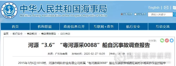 2月27日,中國海事局公開了一艘采砂船自沉事故的調查報告。