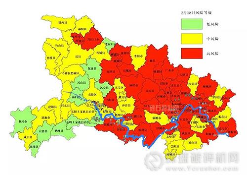 2月29日,湖北省首次發布《湖北省縣(市、區)新冠肺炎疫情風險等級評估報告》,按低風險、中風險、高風險三個等級對所有103個縣(市、區)進行了等級評估。砂石骨料網對該圖進行了簡單加工,我們就可以大致了解目前湖北省沿江不同市縣砂石礦山受管控的嚴格程度。