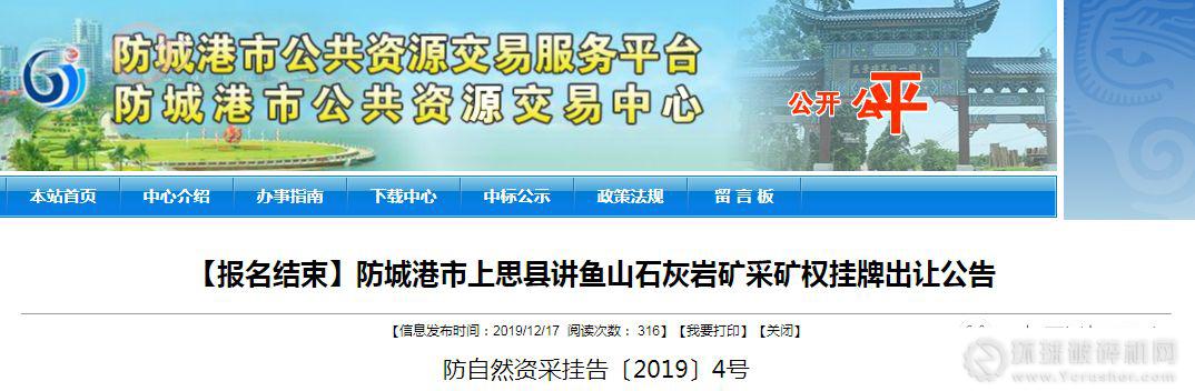 “防城港市上思縣講魚山石灰巖礦”采礦權掛牌成交結果公示如下: