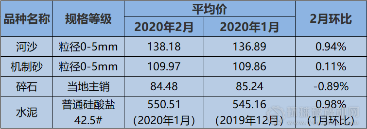 據了解,1月江西省河砂(粒徑0-5mm)、機制砂(粒徑0-5mm)、碎石(當地主銷)每噸的平均價格分別為136.89元、109.86元、85.24元,環比分別微漲1.04%、微跌0.50%、微漲1.27%。2月江西省河砂(粒徑0-5mm)、機制砂(粒徑0-5mm)、碎石(當地主銷)每噸的平均價格分別為138.18元、109.97元、84.48元,環比分別微漲0.94%、0.11%、微跌0.89%。