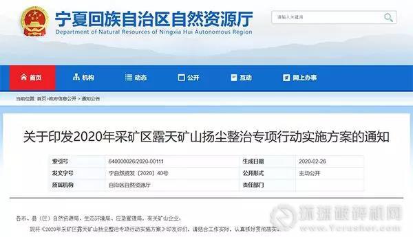 自治區自然資源廳印發《2020年采礦區露天礦山揚塵整治專項行動實施方案》。各市、縣(區)自然資源局要結合本地實際制定露天礦山揚塵整治專項行動實施方案。