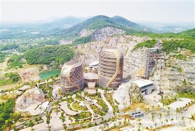2016年7月,上海一企業通過公開出讓,出價6600萬元獲得礦坑用地,次年12月,又以5.85億元取得645畝廢棄工業用地,一體打造礦坑酒店和取名“龍之谷”的大型主題公園。這家企業接手廢棄礦山后,并沒有簡單地整地復綠,而是將生態修復和礦山再利用結合,因地制宜、藝術加工,建成兩座外形酷似蜂巢的酒店建筑,對礦山殘留的崖壁消險后,聘請了100多名工匠耗時兩年多打鑿,雕琢成兩座30米高的“臥獅”,一左一右拱衛酒店,并將破碎的山脊平整出休閑步道,通向山頂觀景平臺,真正做到物盡其用。歷時3年,這個建筑面積達10.5萬平方米的超五星級礦坑酒店終于落成,一經面世便成“網紅酒店”。