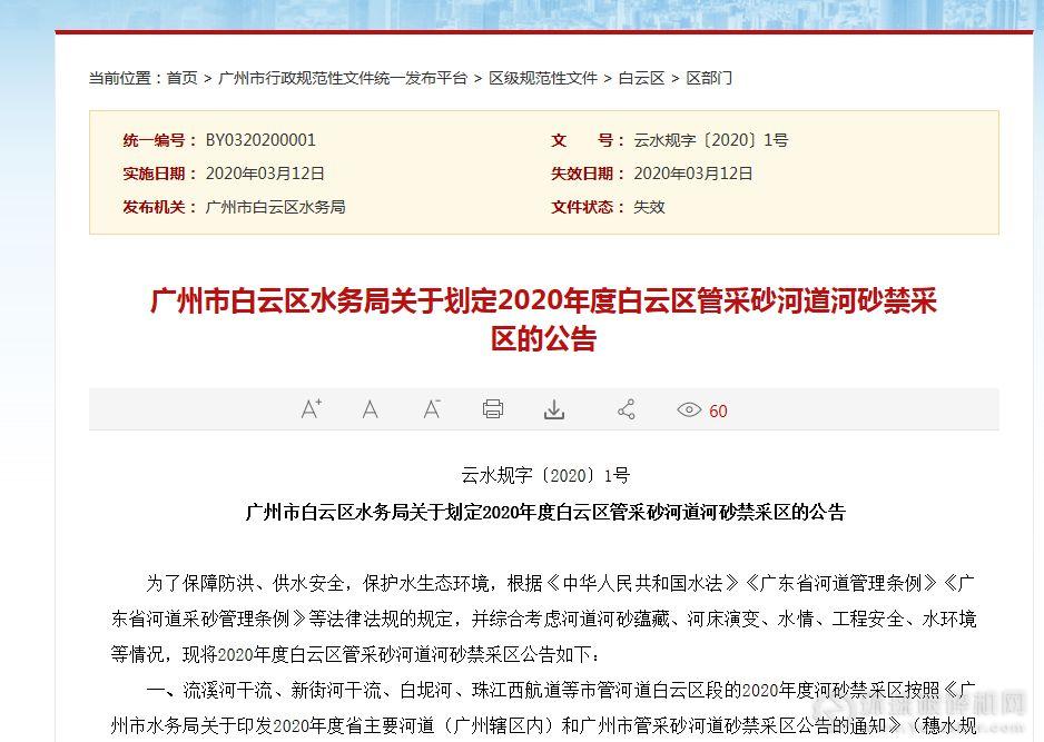 3月12日,廣州市白云區(qū)水務局發(fā)布關(guān)于劃定2020年度白云區(qū)管采砂河道河砂禁采區(qū)的公告,公告指出,白云區(qū)轄區(qū)內(nèi)所有河道(河涌)劃定為2020年度河砂禁采區(qū)。
