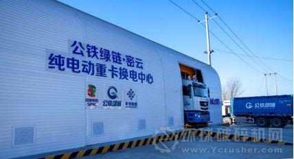 2020年3月16日由北京密云區威客礦山至大興區攪拌站的砂石骨料運輸就是采用了這種模式。該線路全程120公里,由鐵路運輸完成巨各莊站運至黃村站的市內長距離運輸,兩端接駁采用6*4標載型純電動車(如圖2所示),最大續航里程達170公里;配套在密云威克礦山創建國內首例重卡換電站(如圖3所示),可做到充電1小時換電6分鐘,大大提升了新能源車的利用效率,同時搭配儲能設備,充分利用波谷電量,實現電力資源的科學利用。此外創新性的應用自主研發的鐵路砂石專用集裝箱,解決了道路通過性差,運輸過程中產生揚塵污染等問題,實現了國內首例大宗物資在市內通過“鐵路干線+新能源重卡接駁”的全過程零排放綠色運輸。密云威客礦山的“鐵路干線+新能源重卡接駁”綠色運輸模式,不僅是北京礦建材料綠色運輸新模式的里程碑,同時也將為國內其他城市帶來示范引領作用。