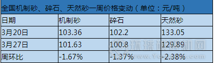 據了解,近日,全國機制砂均價101.63元/噸,周環比下跌1.67%;碎石均價在100.8元/噸,周環比下跌1.37%;天然砂均價在129.89元/噸,周環比下跌2.38%。