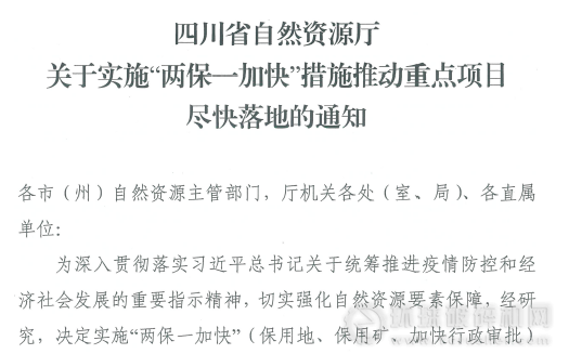 4月2日,四川省自然資源廳舉行新聞通氣會,發布《關于實施“兩保一加快”推動重點項目盡快落地的通知》,從保用地、保用礦、加快行政審批三方面提出了10條措施。