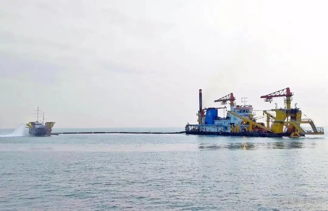 該項目面臨淤泥覆蓋層厚、砂層密實度高、風浪影響大、砂質管控嚴等施工難題,同時面臨春節和疫情的雙重影響,為項目早日順利開工增加了巨大的壓力。為確保項目按期保質保量完成,中交天航局成立專班小組,積極開展調研并及時協調主力船舶“天禹”在最短時間內調遣到位。聯合項目部統籌施工安排,優化資源配置,改進施工工藝,最終在7天內完成整個裝駁平臺的制造。以上措施有效保證了項目的順利開工。截止目前,該工程投入了“天禹”船、5000噸皮帶運輸船、裝駁平臺和錨艇等設備。