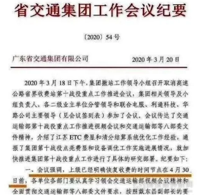 廣東省交通運輸集團會議紀要:上級明確恢復收費的時間節點在4月30日前。