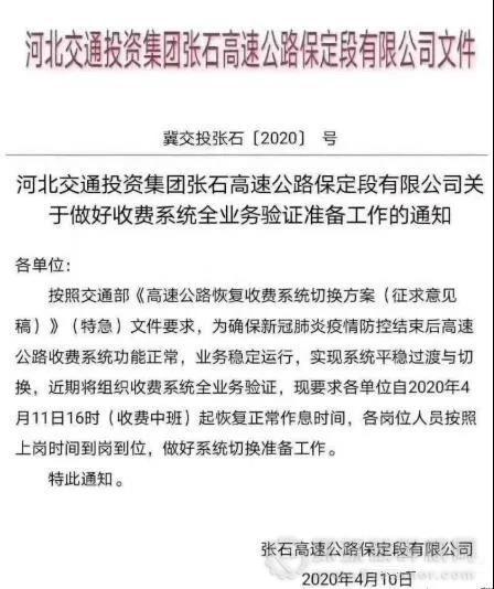 河北張石高速公路保定段有限公司通知:4月11日16時(收費中班)起恢復正常作息時間,各崗位人員按照上崗時間到崗到位,做好系統切換準備工作。