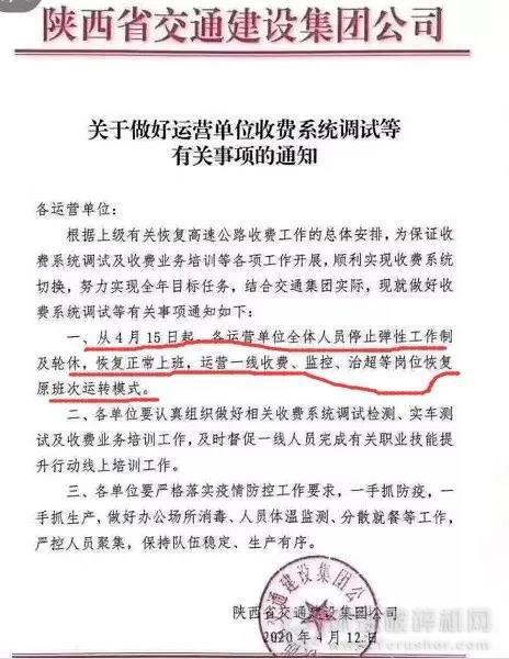 4月12日陜西省交通建設集團公司通知:4月15日起,各運營單位全體人員停止彈性工作制及輪休,恢復正常上班,運營一線收費、監控、治超等崗位恢復原班次運轉模式。