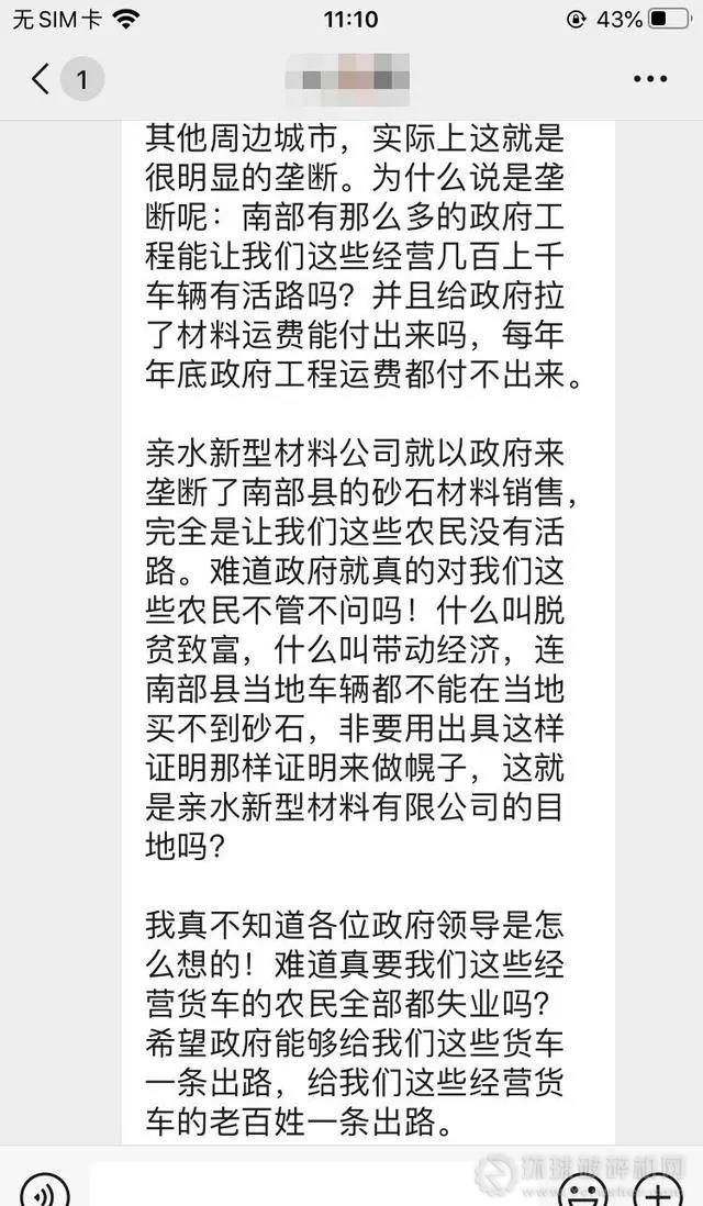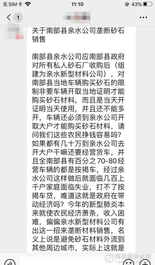 同時砂石屬于稀土資源,屬于不可再生產資源。疫情期間本來資源就緊缺,南部縣親水新材料開發有限公司有義務和責任保障南部本地材料的供給,不讓砂石流向外地而造成損失。也希望司機能夠站在大局考慮,為了南部縣長遠的布局考慮。