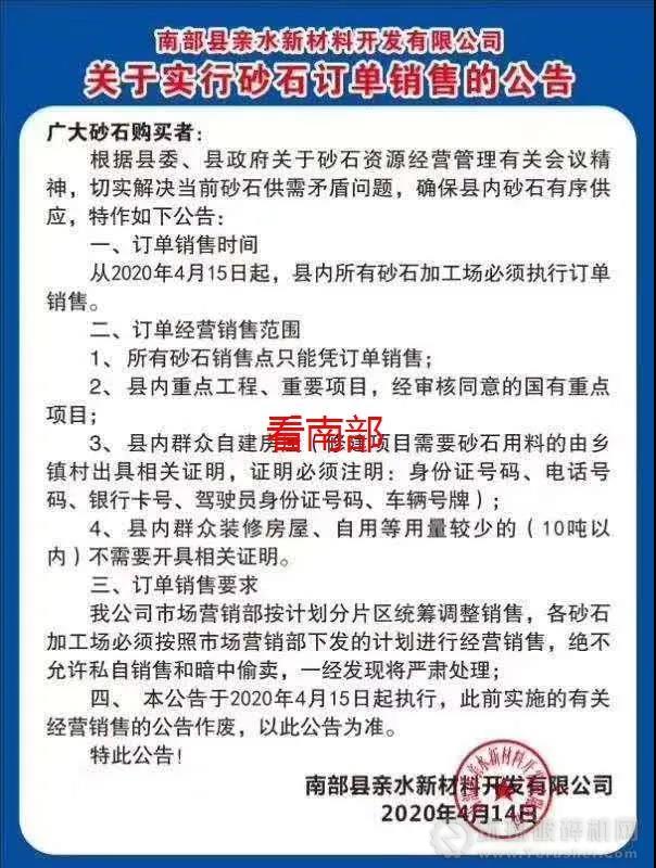 之前國務院要求各級部門在辦理手續的時應當從簡,避免群眾少跑路。我們也希望南部負責砂石的公司以及有關部門能夠簡化辦理程序,同時也要考慮到南部縣域內小型企業及各位的砂石用量,讓群眾真實惠。
