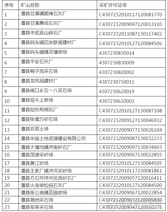 根據湖南省人民政府辦公廳關于《湖南省普通建筑材料用砂石土礦專項整治行動方案(2019--2021年)》(湘政辦發〔2019〕54號)文件要求,2020年4月7日,我局對縣境內澧縣甘溪鎮順緒石灰廠等23家過期礦山企業提請縣人民政府同意予以關閉,下一步我局將按照程序和時間要求依法實施關閉,對其采礦許可證在“礦業權配號系統”中予以注銷。