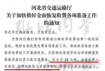 據了解,日前,河北省交通運輸廳發布《關于加快做好全面恢復收費各項準備工作的通知》稱為堅決打贏打好取消高速公路省界收費站第十戰役攻堅戰,做好全面恢復收費各項準備工作,確保取消高速公路省界收費站工作圓滿收官,為促進全省經濟社會持續健康發展提供高品質公路交通服務,自4月24日起,全體收費人員返崗,收費站恢復正常收費模式。