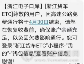 近日,很多浙江ETC用戶收到同樣一條短信,短信的內容大致是:因高速公路免費通行將于4月30日結束,請大家保持賬戶余額充足。