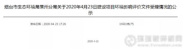 2020年4月23日,煙臺市生態環境局對近期建設項目進行了環境影響評價文件受理情況的公示。
