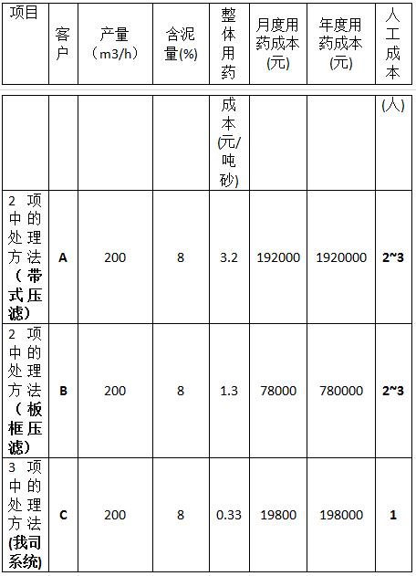 項(xiàng)目客戶產(chǎn)量(m3/h)含泥量(%)整體用藥成本(元/噸砂)月度用藥成本 (元)年度用藥成本(元)人工成本(人)