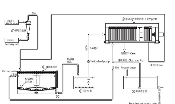 流程如下:洗砂機(jī)→細(xì)砂回收機(jī)一臺(tái)(進(jìn)行0.075以上的顆粒回收)→廢水中轉(zhuǎn)水池(中轉(zhuǎn)以方便小部份細(xì)砂沉淀,可用可不用)→廢水處理系統(tǒng)(進(jìn)行變量加藥沉淀、清水回收、淤泥濃縮)→板框壓濾機(jī)(淤泥干化),如下圖所示: