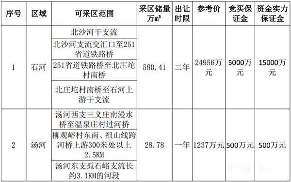 ◇ 湯河28.27萬立方米河道砂石,出讓年限一年,參考價1237萬元,競買保證金500萬元,資金實力保證金500萬元。