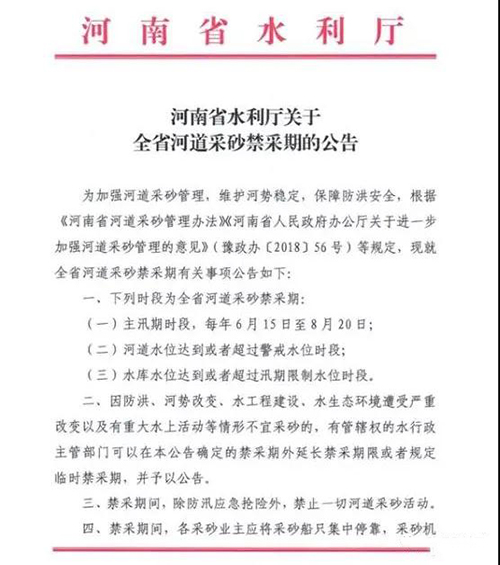 根據(jù)河南省水利廳發(fā)布的《關(guān)于全省河道采砂禁采期的公告》,主汛期(6月15日至8月20日)禁止一切河道采砂活動(dòng)。