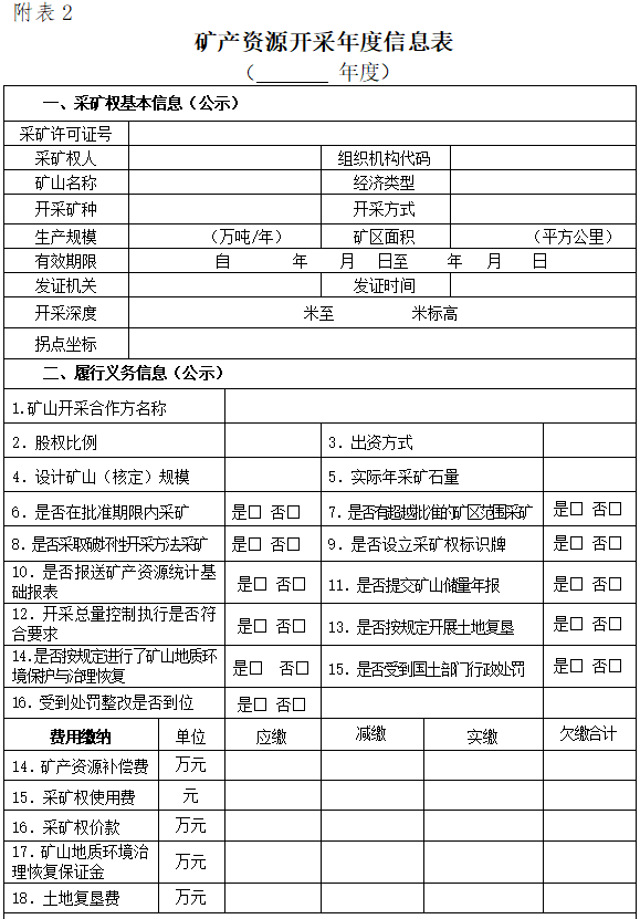 根據《礦業權人勘查開采信息公示辦法(試行)》,地熱、礦泉水和建筑用砂石、粘土礦原則只填報礦產資源開采年度信息表中的一、二部分(采礦權基本信息、履行義務信息)內容,具體由省級國土資源主管部門提出填報要求。