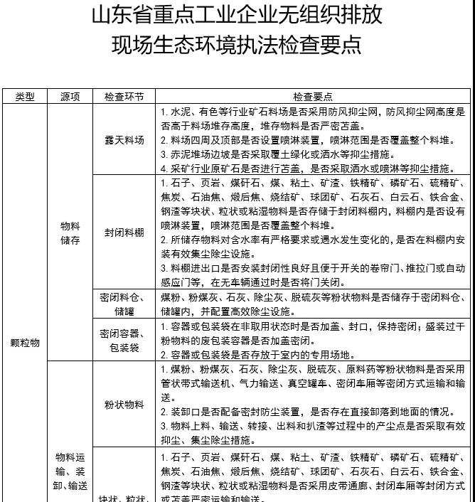 同時,《指導意見》還公布了重點工業企業無組織排放現場生態環境執法檢查要點,針對露天料廠、封閉料棚、石子等塊狀物料的運輸顆粒物排放現場生態環境執法要點進行了詳細規定。