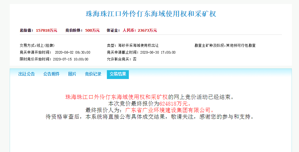 7月15日,珠海珠江口外伶仃東海域使用權和采礦權的網上競價活動最終報價為624818萬元。最終報價人為:廣東省廣業環境建設集團有限公司。